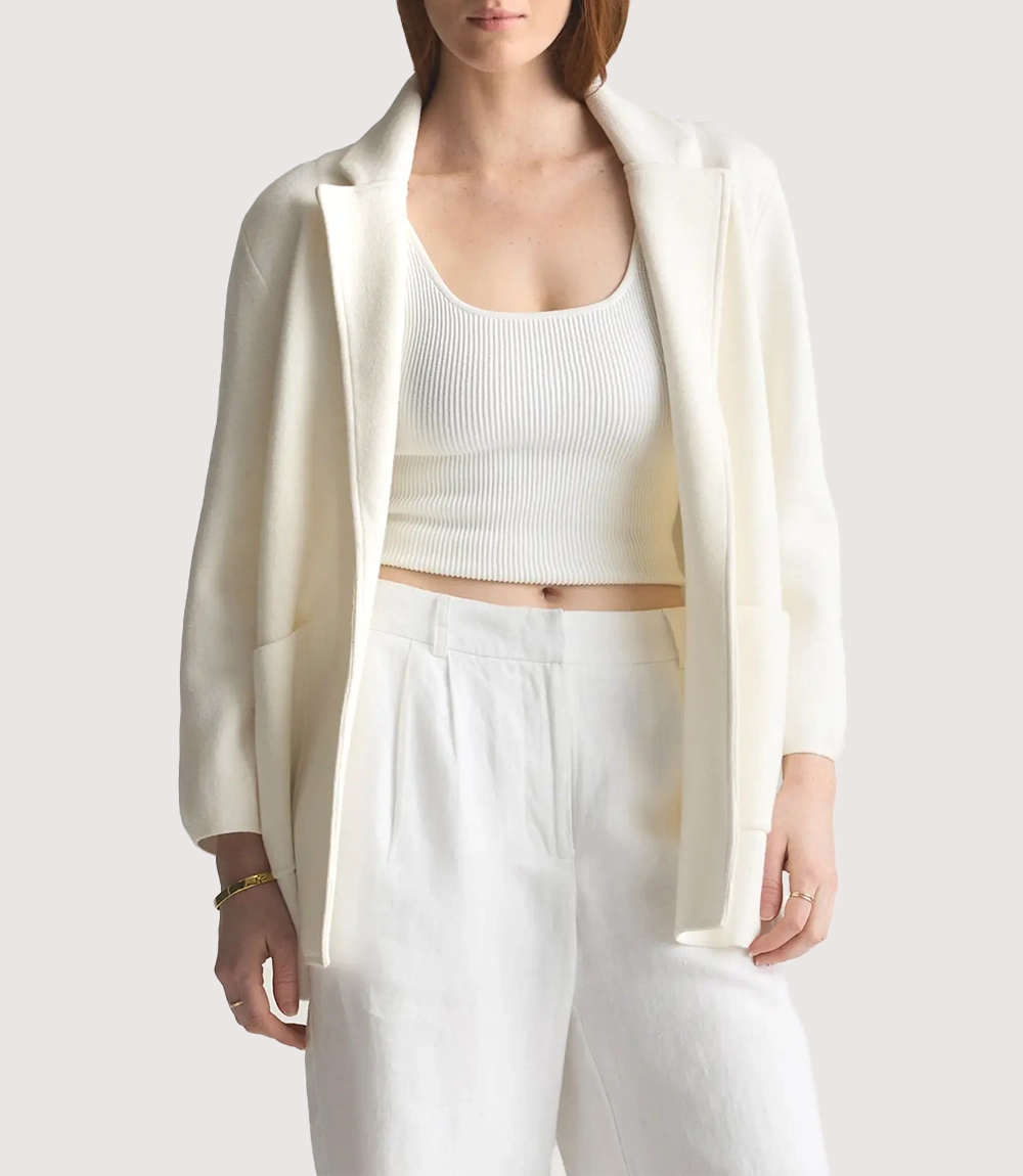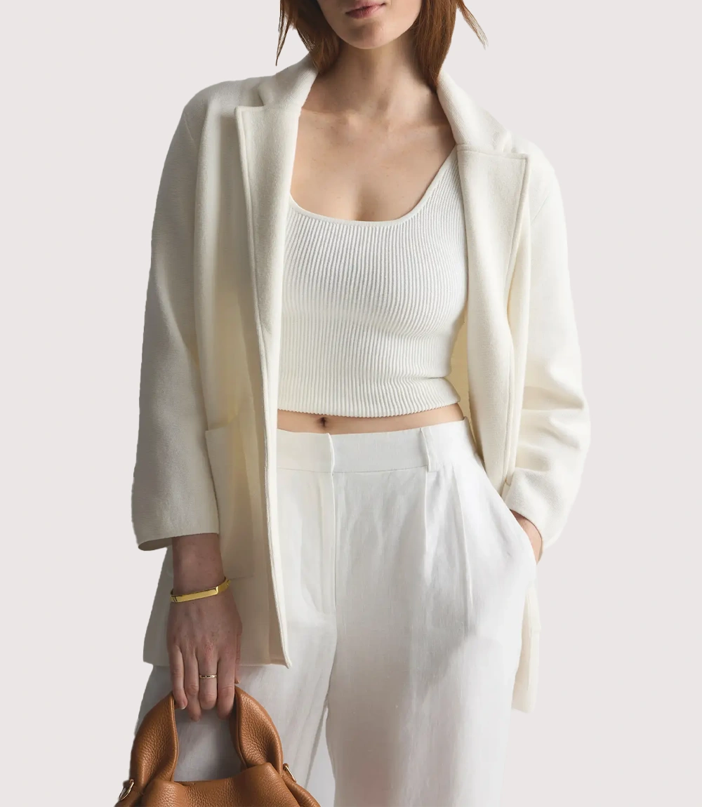 We have all been there—you want to dress professionally for the meeting, but the idea of wearing the stiff and constraining blazer sounds completely draining. This is exactly where the white cotton knit blazer comes into the picture. It is literally the “cheat code” solution for the office.